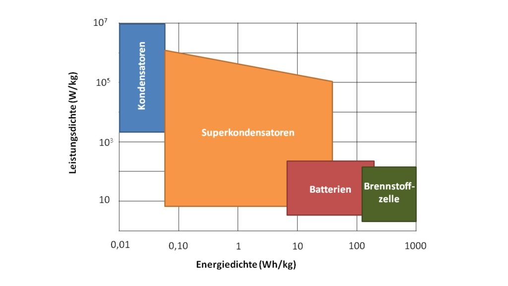 Im Gegensatz zu herkömmlichen Lithiumionen-Akkus schwächeln sie aber bei der Energiedichte. Superkondensatoren müssten viel größer sein, um die gleiche Menge Energie speichern zu können wie Akkus. Lithiumionen-Akkus erreichen eine Energiedichte von bis zu 265 Wattstunden pro Kilogramm, bisherige Superkondensatoren nur etwa ein Zehntel davon.