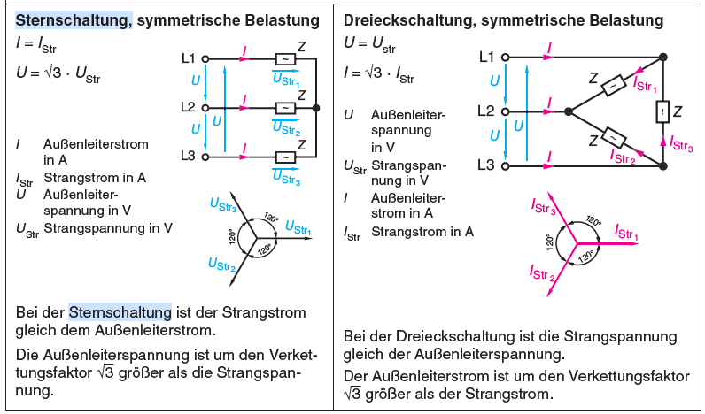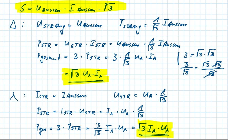 Um zu verstehen, wo Wurzel3 herkommt, müssen wir die Strangströme (Dreieck) bzw. Strangspannungen (Stern) betrachten
